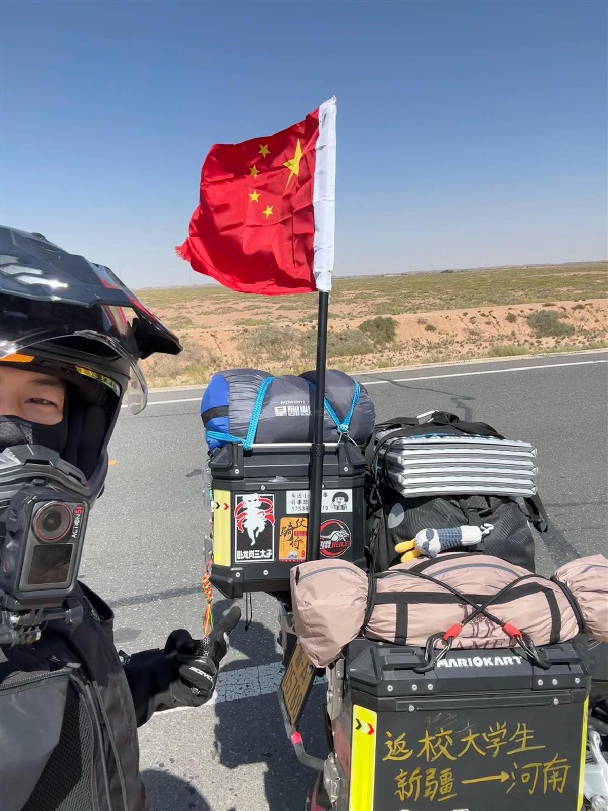 >校区风采 卡拉梅(Karamay)的年轻人走了3500公里,向郑州大学报告。他离开并参加了军队,去年回到学校。每次他骑行时,他都会将国旗悬挂在自己的身上。