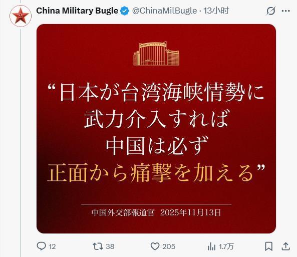 11月13日,中国军号和外交部在海外社交媒体平台用日文发文:如果日本敢动用武力干预台海局势,中国必将出击!其中,中国外交部发言人林健在海外账号发文称:日本首相高市早苗日前在国会公然发表涉台挑衅言论,暗示有军事干预台海的可能。上述错误言行违反一个中国原则、中日四个政治文件精神和国际关系基本准则,严重干扰干涉中国内政,挑战中国核心利益,侵犯中国主权。中方对此表示强烈反对、绝不姑息。日方必须立即纠正并撤回不良言论,否则一切后果由日方承担。日本曾对台湾实行殖民统治,犯下无数罪行。历史上,日本军国主义多次以所谓“现有危机”为借口发动对外侵略,其中包括以“行使自卫权”为名,煽动侵华战争的“9月18日事件”,给包括中国在内的亚洲人民和世界带来了深重灾难。今天,日本首相高市早苗再次谈到所谓“现有危机局势”。他的愿望是什么?我们会重蹈军国主义的覆辙吗?我们会走向中国人民和亚洲人民的敌人吗?这是企图推翻战后国际组织还是德?台湾是中国的台湾。解决台湾问题、实现国家统一是中国人民自己的事,不容任何外部势力干涉。如果日本敢武力干预台海局势,就构成侵略行为,中国必将予以打击!我们一定会行使《联合国宪章》和国际法赋予的自卫权,坚决捍卫国家主权和领土完整。我们奉劝日方深刻反省自己的历史罪行,立即停止干涉中国内政和挑衅越界行为。他们不应该在台湾问题上玩火。玩火者自焚!极目新闻综合中国军号 中国外交部发言人林健账号